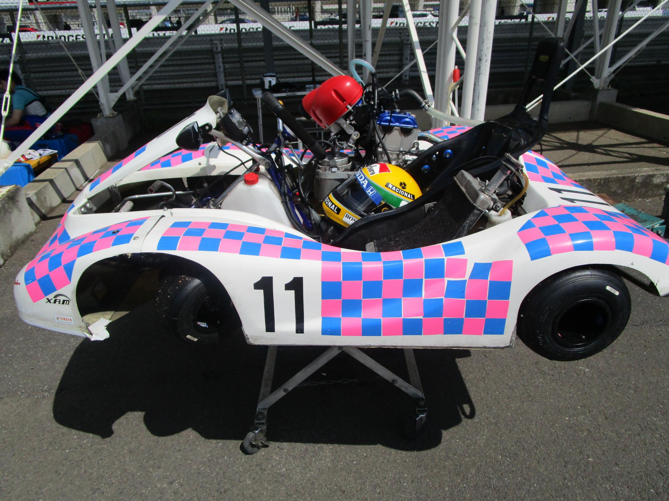 ![]() 今年は、フルカウル仕様を試しています。ただし、フレームはコスミックの20年落ちの年代ものです。このカウルを使用している者は自分だけです。他者は戦闘力のあるドライカーボン製の高価なカウル使用がほとんどですが、資金的に導入は困難です。シートはヨーロッパ製のスーパーカート専用品です。写真のヘルメットは我々と同世代のアイルトン・セナモデルです。セナはSHOEI愛用者でしたが、SHOEIは現在4輪用を製造していません。そこでやむを得ず一番4輪モデルに近い2輪用ワイバーンをエアダクトを埋めるなどの加工をプロショップに依頼しレプリカを作りました。ただし、現在SHOEIワイバーンも廃番のため、SHOEIを使いセナモデルを作ることはできなくなりました。 さて、レース当日の筑波は、路面温度は50度近い炎天下の危険な暑さの一日でした。レースは何とか中団位置で終了しました。どうしても最終コーナーをワンオフせざるを得ず全開でいけるセットが出ないため1コーナーまでの最高速に差がつきます。次のレースまでに対策が必要です。次回は、8月27日の筑波ミニバイクレースのサポートレースですが、お休みし、もてぎ北ショートカートレースのオフィシャル参加予定です。10月の筑波最終戦は参戦予定です。